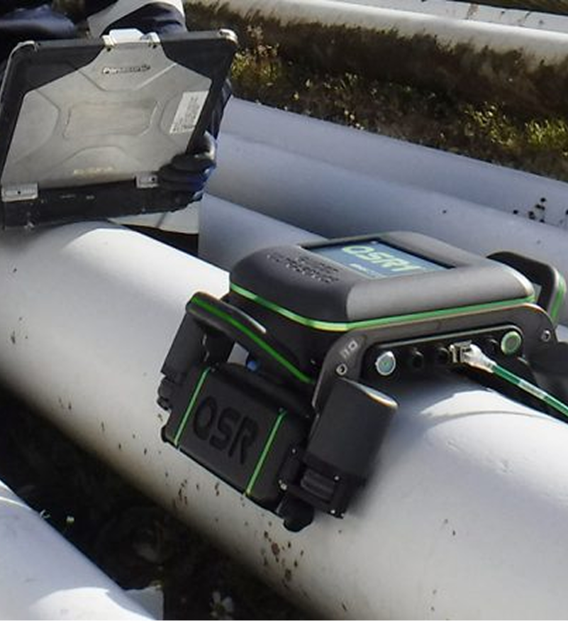 The QSR1® device utilizes Quantitative Short Range (QSR) Technology to measure remaining wall thickness in pipelines, particularly in areas susceptible to corrosion under pipe supports. It operates by moving axially along the pipe, sending guided waves circumferentially to generate a thickness profile of the area of interest. Features of the QSR1® include a lightweight design, removable battery, robust construction, high-speed data acquisition, a 7” LCD touch screen, semi-automated scanning, and an extended frequency range.